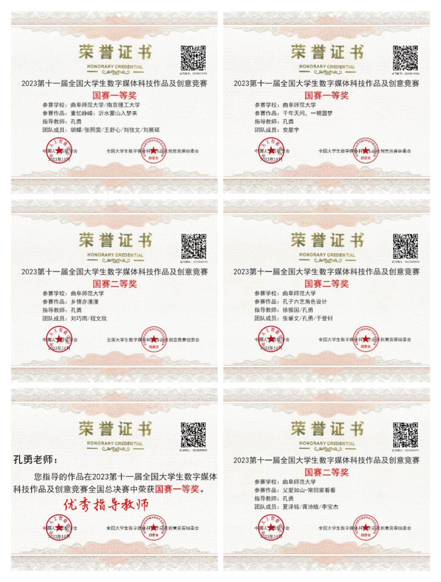 曲阜师大传媒学院讯   近期,第十一届全国大学生数字媒体科技作品及创意竞赛现场总决赛结果揭晓。曲阜师大传媒学子在本届大赛中斩获佳绩,共获得国赛一等奖2项、二等奖3项,教师孔勇获国赛一等奖优秀指导教师荣誉称号。