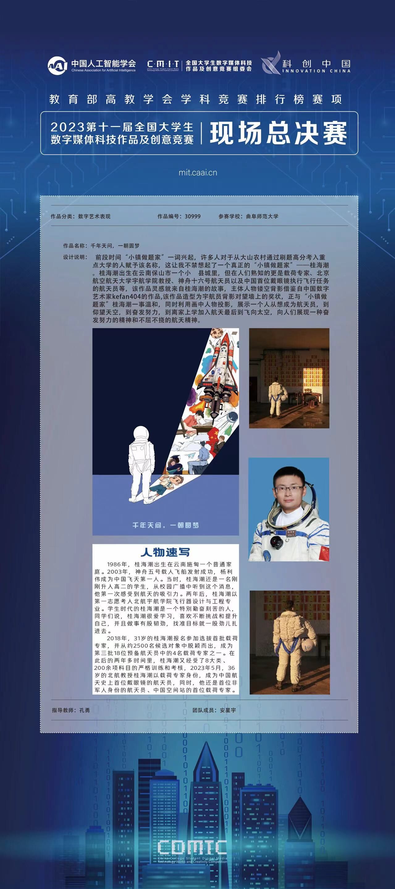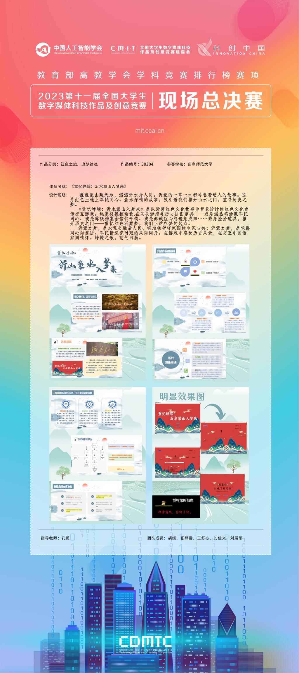 全国大学生数字媒体科技作品及创意竞赛作为教育部中国高等教育学会大学生学科竞赛排行榜单赛事,已成为引领大学生创新创业、实践技能提升的科技与艺术融合的重要赛项。本届赛事中,传媒学子胡蝶、王舒心、刘佳文、刘展硕制作作品《重忆峥嵘:沂水蒙山入梦来》,通过游戏形式助力沂蒙精神创造性转化、创新性发展;安星宇的插画作品《千年天文,一朝圆梦》以独具特色的构图与精巧绘画风格,讲述桂海潮坚守初心、砥砺奋进,完成“天问”之约的励志故事;两项作品均获得国赛一等奖。另外,《乡情亦漫漫》《孔子六艺角色设计》和《父爱如山——常回家看看》获得国赛二等奖。获奖作品充分展示了传媒学子在专业竞赛中大胆创新、臻于至善的优秀品质,展现出脚踏实地、勇于追梦的青春风采。