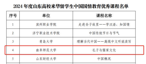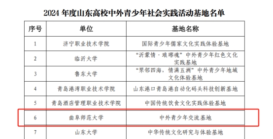 曲阜师大国际教育学院讯 近日,山东省教育国际交流协会公布了2024年度山东高校来华留学生中国国情教育优秀课程和中外青少年社会实践活动基地名单,曲阜师大开发的《孔子与儒家文化》获批山东高校来华留学生中国国情教育优秀课程;报送的“中外青少年交流基地”被评为2024年度山东高校中外青少年社会实践活动基地。