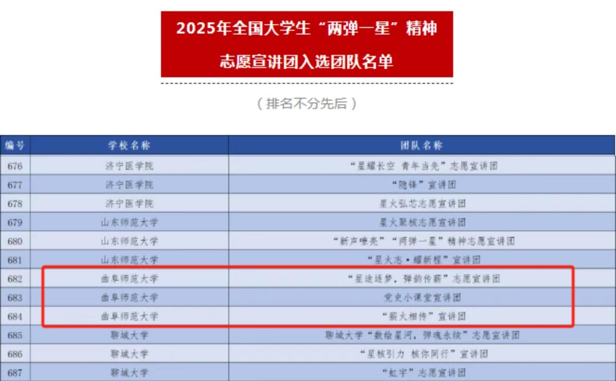 2025年全国大学生“两弹一星”精神志愿宣讲团曲阜师大入选团队公示名单