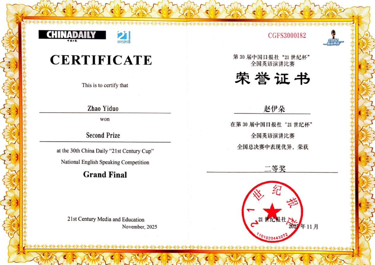 翻译学院讯 11月13日至17日,第30届“21世纪杯”全国大学生英语演讲比赛总决赛举行,翻译学院2022级商务英语专业学生赵伊朵(指导教师:张巍),凭借扎实的语言功底与出色的临场表现,荣获全国总决赛二等奖。