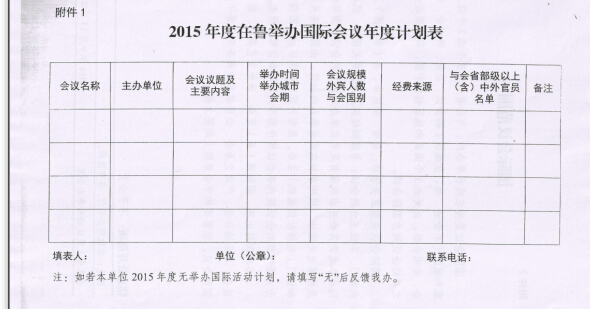 根据山东省外办《关于报送2015年度在鲁举办国际会议年度计划的通知》的文件精神,请各有关单位于10月20前及时将2015年国际会议计划报国际交流合作处。国际交流合作处统一整理后报省外办报批。