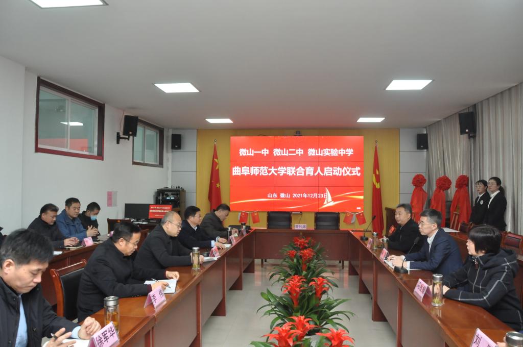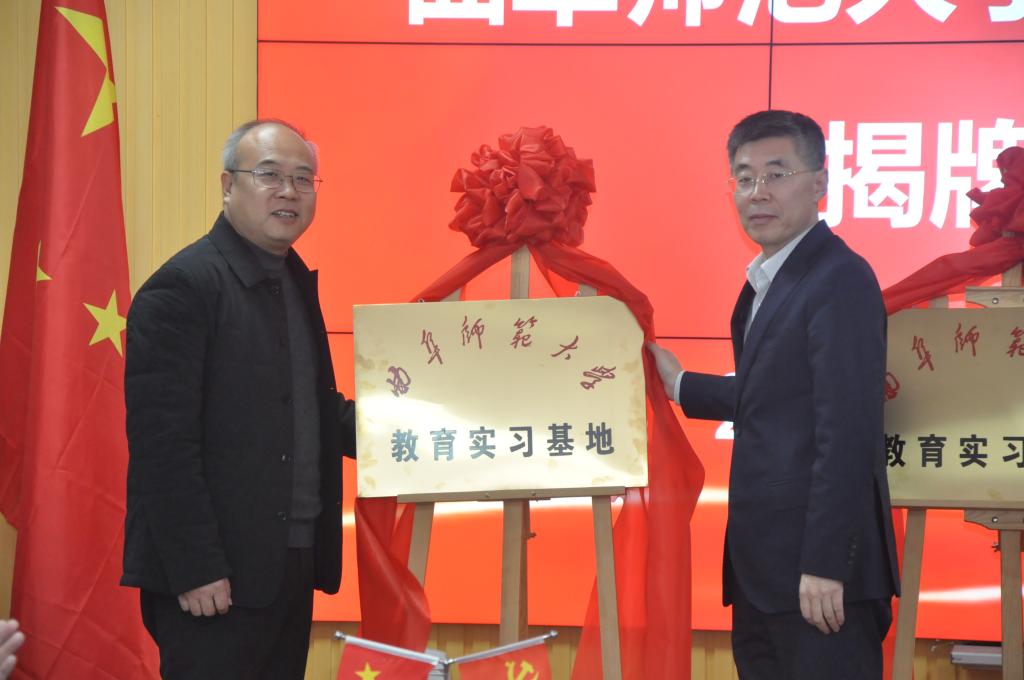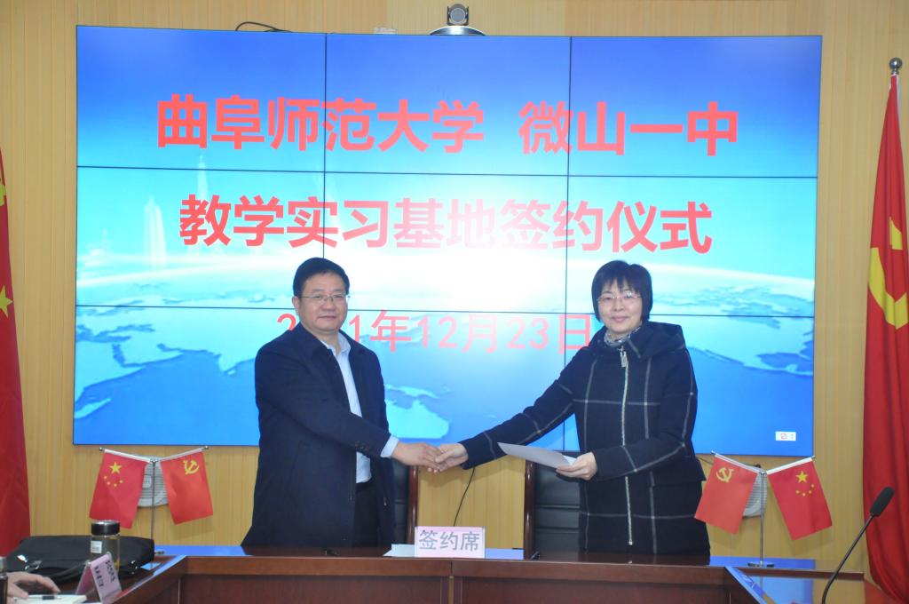 曲阜师大新闻中心讯  12月23日上午,曲阜师大化学与化工学院和微山一中、微山二中、微山实验中学在微山县教育和体育局签署联合育人协议,并为三所教育实习基地揭牌。化学与化工学院党委书记赵琪,院长冯媛媛,学生工作处副处长毛永正,化学院副院长刘鹏,微山县教体局局长王志刚,微山一中校长李锰,微山一中党委书记李伟,微山二中校长岳强,微山县实验中学校长徐军华以及微山县教体局的其他领导一并出席了仪式。仪式由微山一中校长李锰主持。