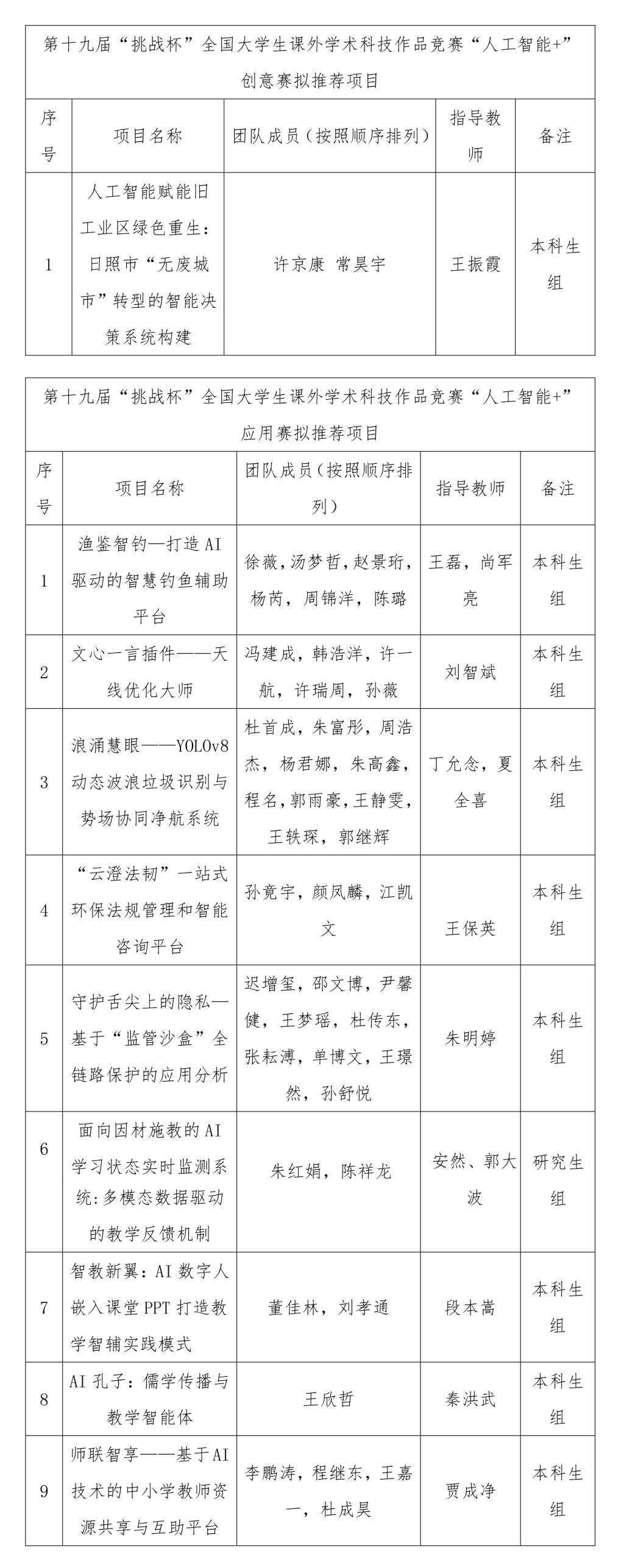 自第十九届“挑战杯”竞赛“人工智能+”专项赛启动以来,经资格审查、校赛等环节,学校拟推荐《人工智能赋能旧工业区绿色重生:日照市“无废城市”转型的智能决策系统构建》等项目参加国赛,详细信息见表格,其排列顺序即为推荐排序。