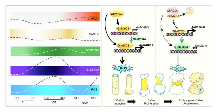 该研究证明GhMYC3通过直接结合GhMYB44GhLBD18启动子中的G-box元件调节其表达,继而维持体细胞胚胎发生过程中细胞多能性状态。此外,GhRCD1GhMYC3拮抗性相互作用,通过抑制GhMYC3的转录活性调控棉花体细胞胚胎发生的进程。有趣的是,GhRCD1GhMYC3GhMYB44GhLBD18在愈伤组织诱导、愈伤组织增殖和胚性细胞获得过程中呈现出时序表达模式,并且调节体细胞胚胎发生过程中ROS的动态积累,表明 GhRCD1-GhMYC3-GhMYB44-GhLBD18组成的转录级联模块可时序性调节细胞内ROS的积累,继而影响体细胞胚胎发生过程中细胞的命运。